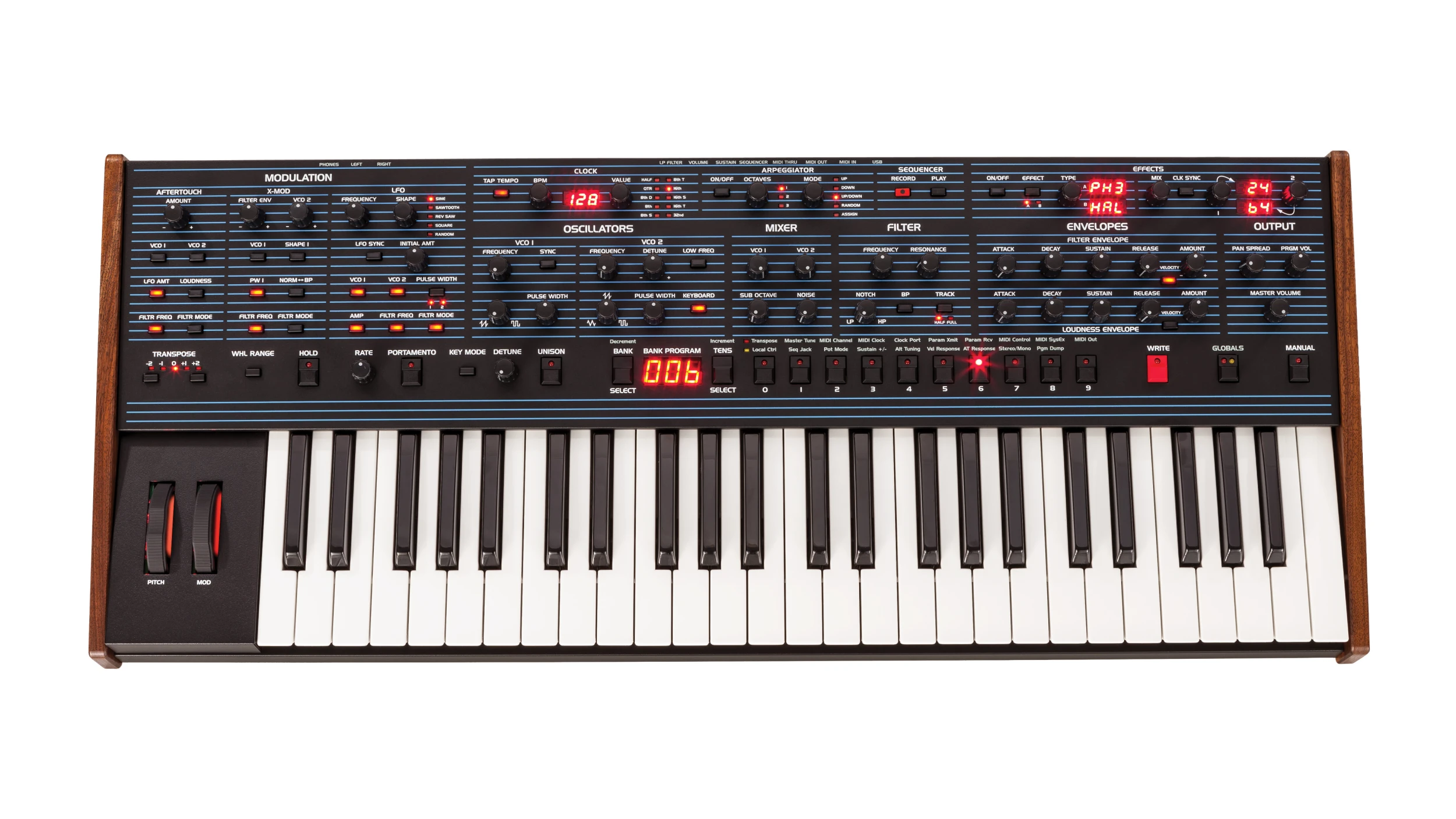 The OB-6 from Dave Smith Instruments is a modern, all-analog 6-voice polyphonic synthesizer that pays tribute to Tom Oberheim's SEM 4-voice and 8-voice synthesizers, but with several enhancements. The synth features true voltage-controlled oscillators, a classic Oberheim-inspired 2-pole, state-variable resonant filter, amplifiers, envelopes, and an LFO. Additional enhancements include studio-quality effects, a polyphonic step-sequencer, and an arpeggiator; all of which can be synchronized internally or via external MIDI clock.